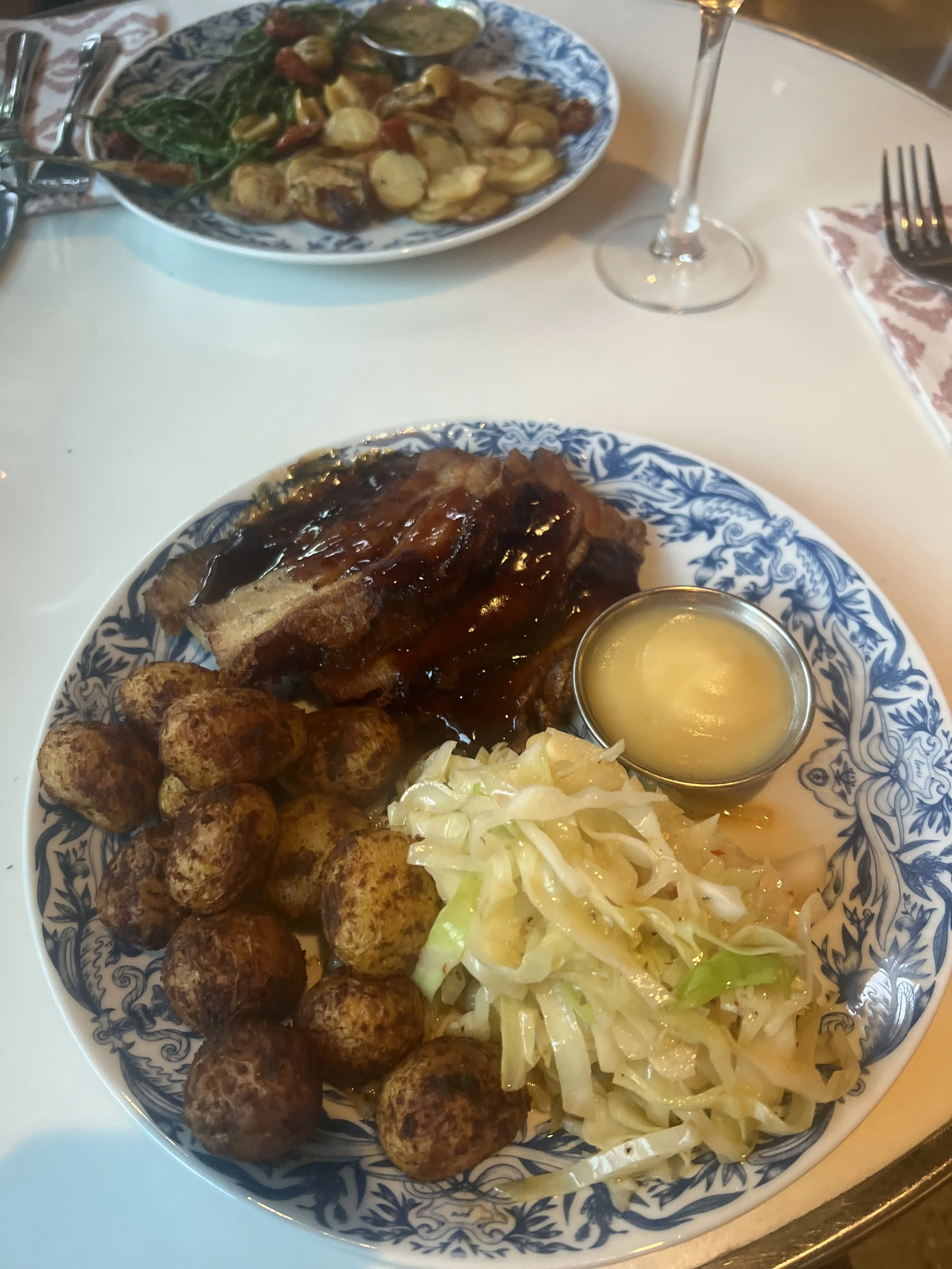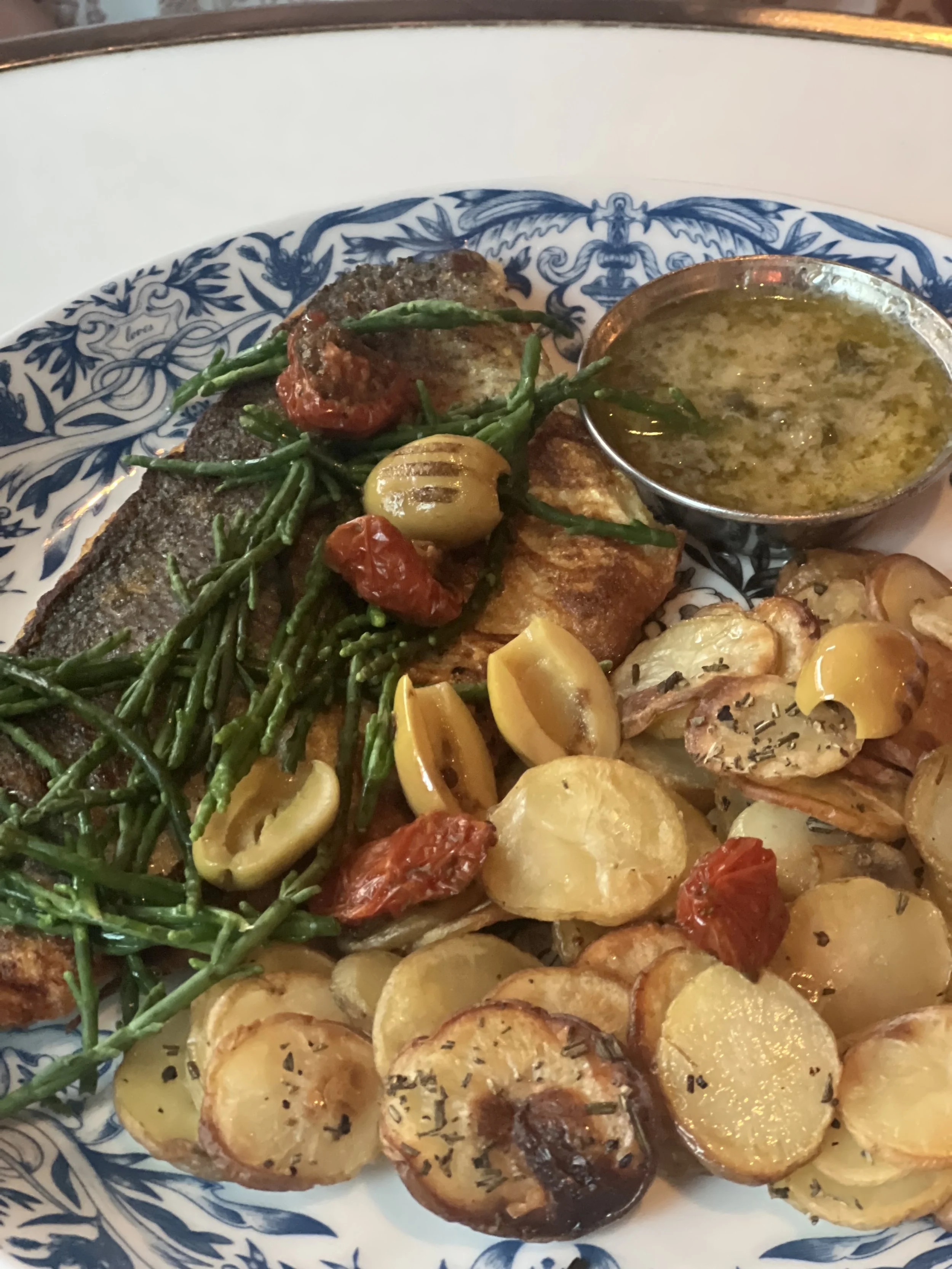 We got off to a good start by sharing a festive-looking and flavoursome charred broccoli dish with crispy kale, a smokey aubergine emulsion, scattered with pine nuts and pickled red chillies. Every dish was served on pretty blue or pink and white China (if you come and like the look, there’s plenty of merch available online, from plates to toiletries).